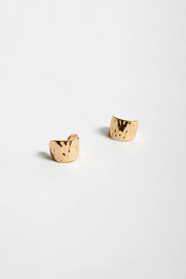 The Mini Textured Curved Metal Earrings in Gold are designed with a softly curved shape and subtle hammered finish; they secure with a simple stud-back closure. Crafted from plated metal.