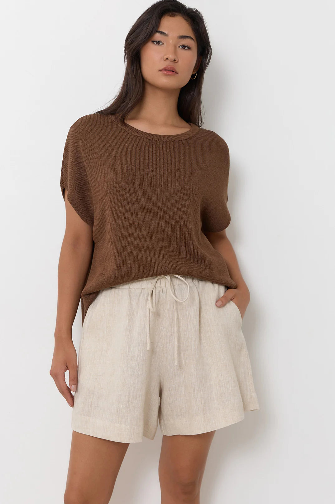 The Helene Knit Top in Chocolate features a round neckline, ribbed edges, and side hem splits for added movement. Designed in a relaxed silhouette for easy, everyday wear.